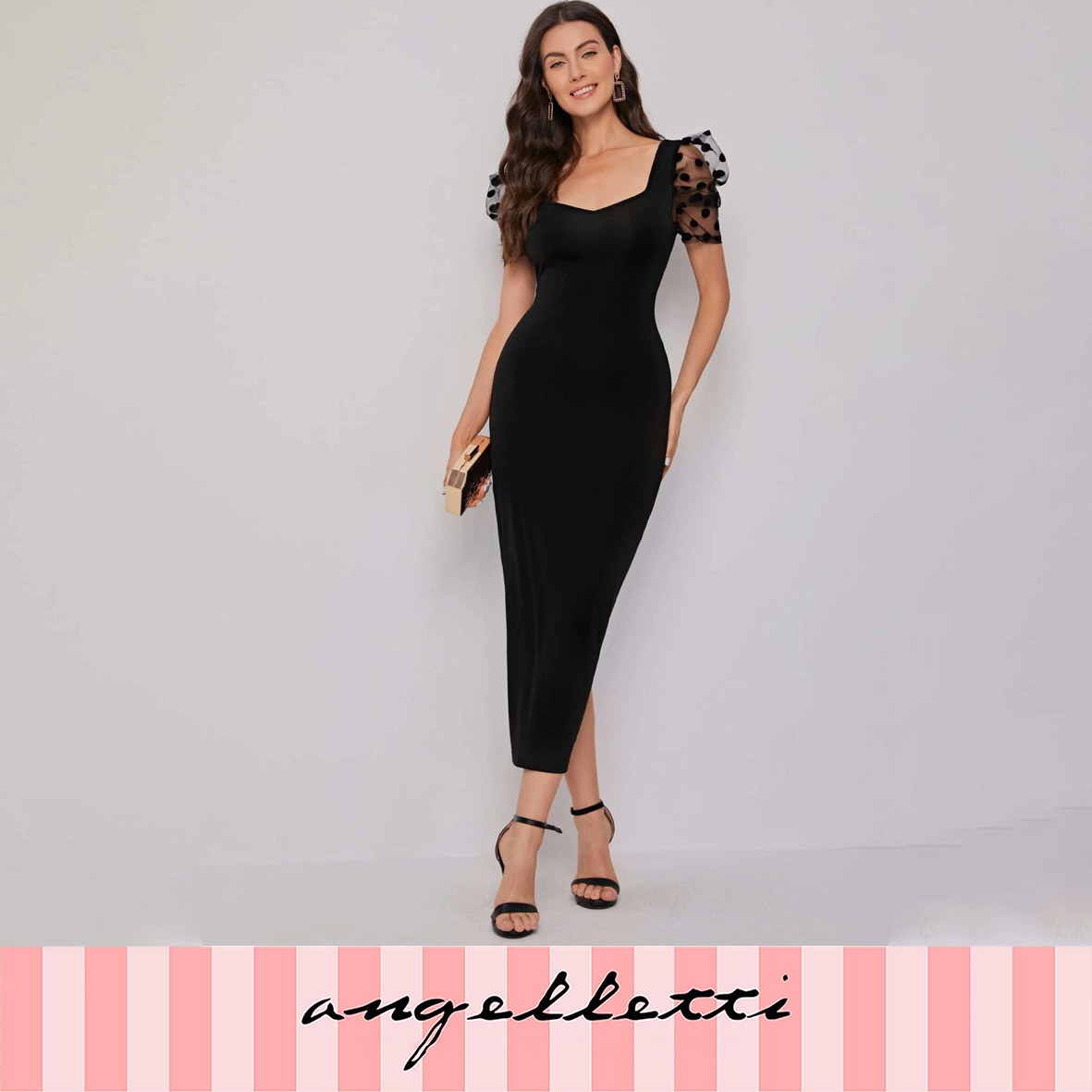 ANGELLETTI Sweetheart Neck Mesh Puff Sleeve Dress M Black