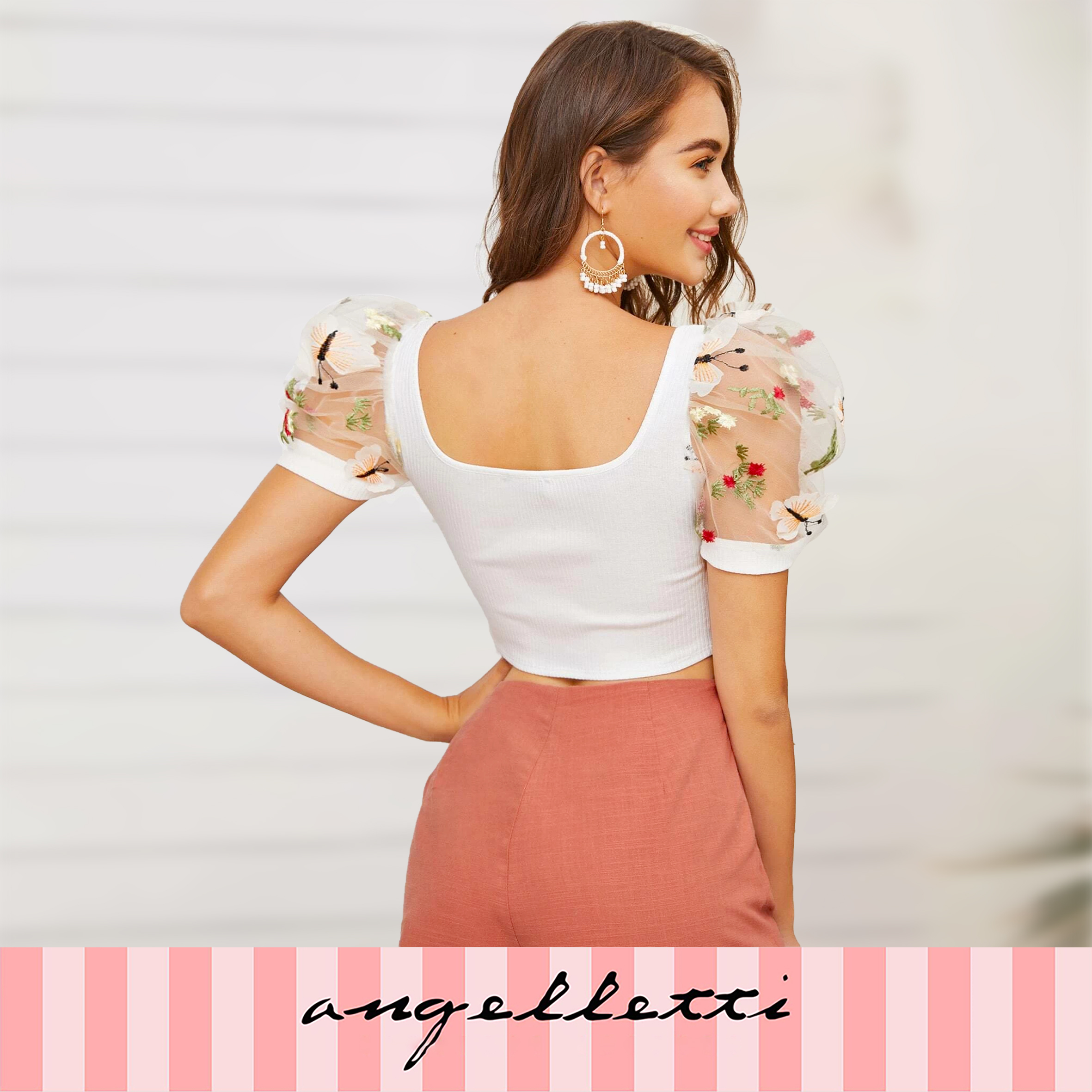 ANGELLETTI Butterfly Applique Embroidered Mesh Puff Sleeve Crop Top S White