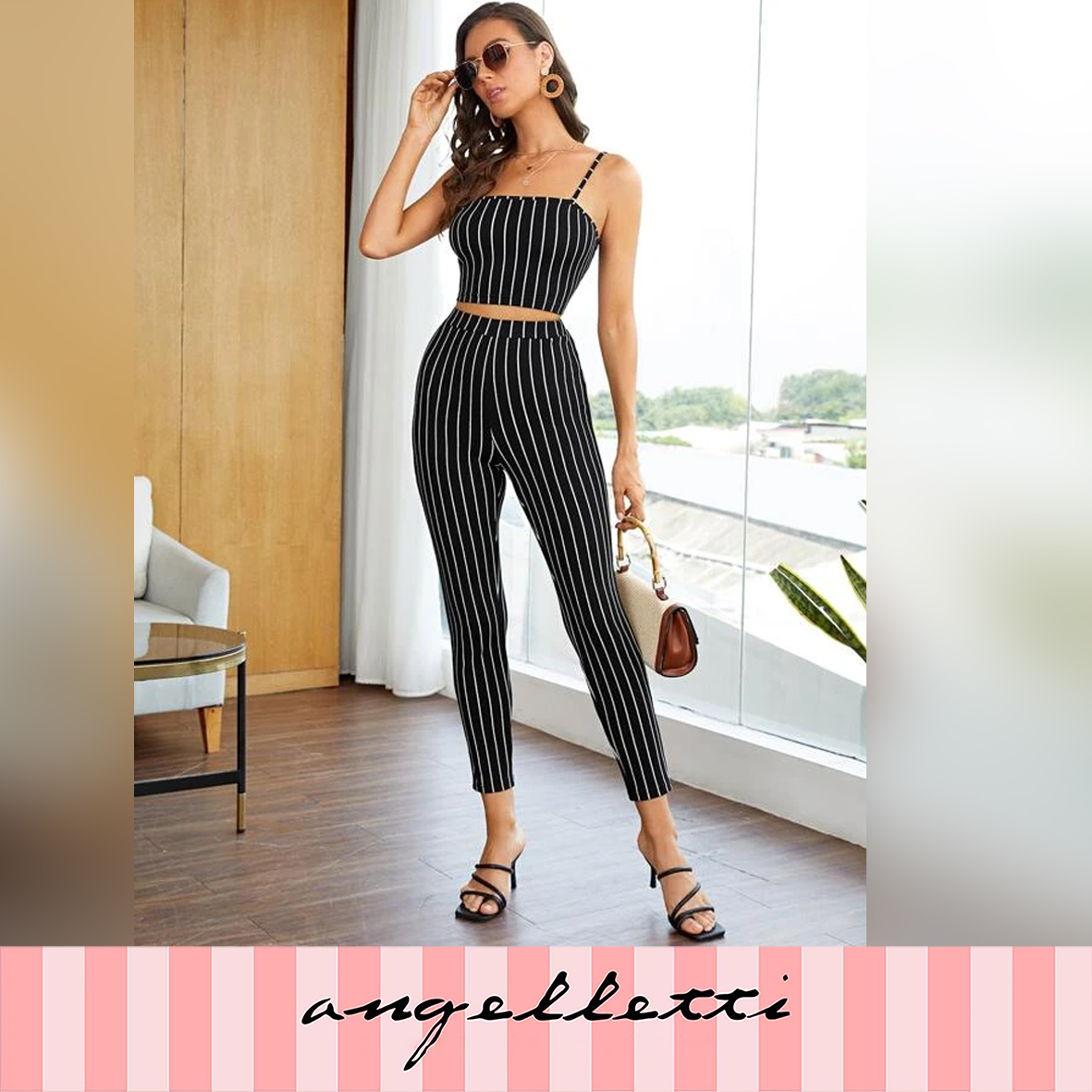 ANGELLETTI Felegant Pinstriped Crop Cami Top & Skinny Pants S Black And White