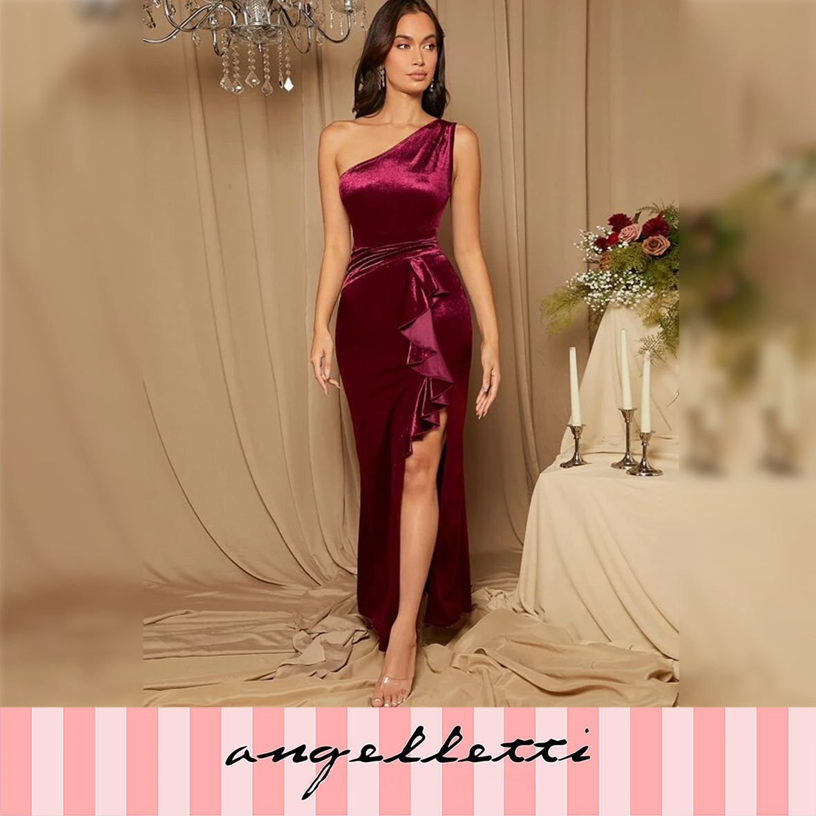 ANGELLETTI Belle One Shoulder Ruffle Trim Split Thigh Velvet Bridesmaid S Mahony Maroon