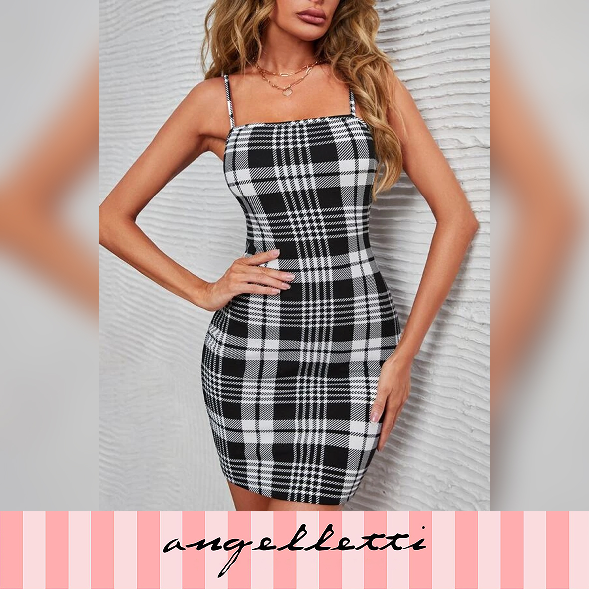 ANGELLETTI Unity Plaid Bodycon Cami Dress S Black And White