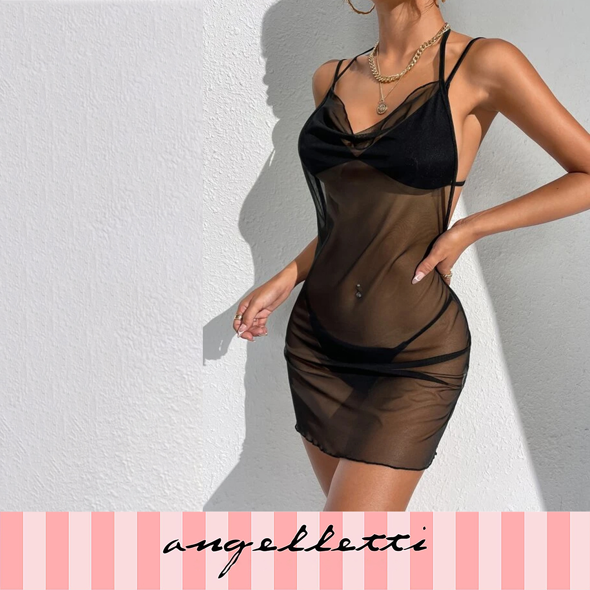 ANGELLETTI SXY Tie Backless Lettuce Trim Mesh Halter Dress Without Lingerie S Black