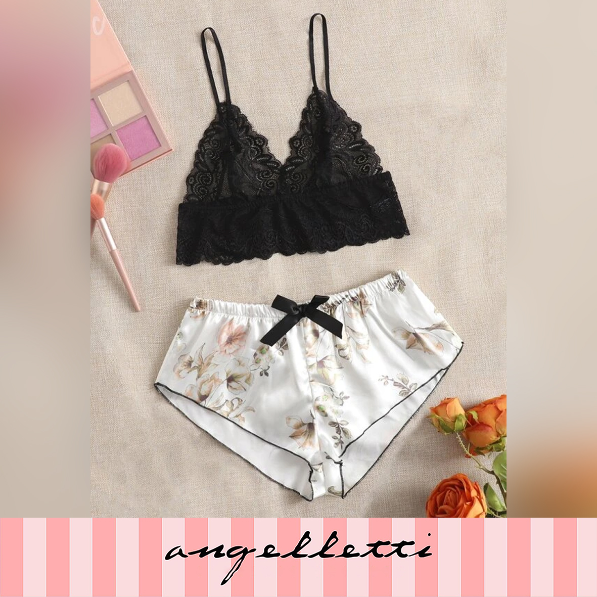 ANGELLETTI Floral Print Contrast Lace Lingerie Set S Multicolor