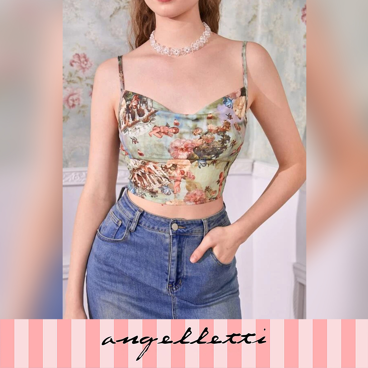 ANGELLETTI MOD Floral & Angel Print Draped Front Cami Top S Multicolor