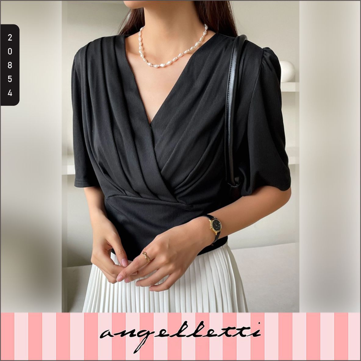 ANGELLETTI DAZY Surplice Neck Puff Sleeve Tee S Black