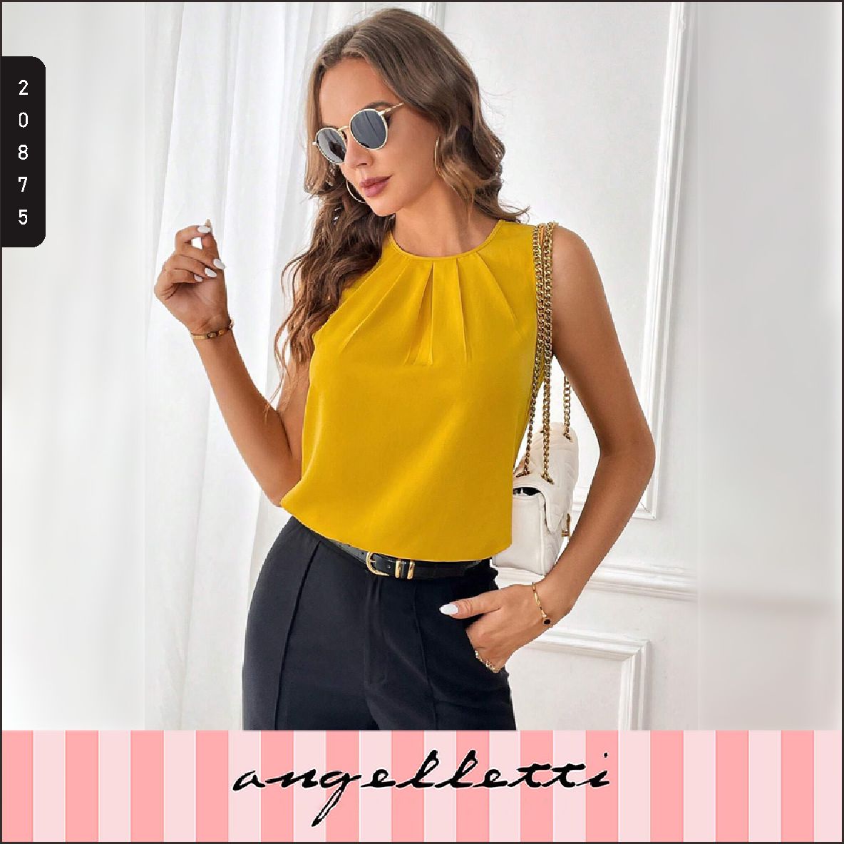 ANGELLETTI Unity Solid Fold Pleated Detail Sleeveless Blouse S Yellow